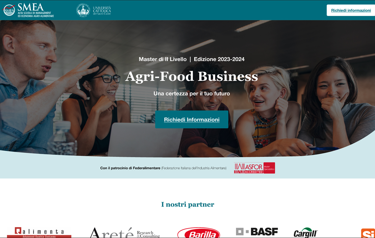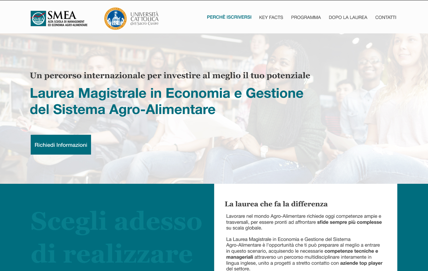 Abbiamo progettato e sviluppato landing page per diversi corsi, tra cui Master of Science in Sustainable Viticulture and Enology, Laurea Magistrale in Economia e Gestione del Sistema Agro-Alimentare (SMEA), Consumer Behaviour, Agri-Food Business e Management per la Sostenibilità (M4S).